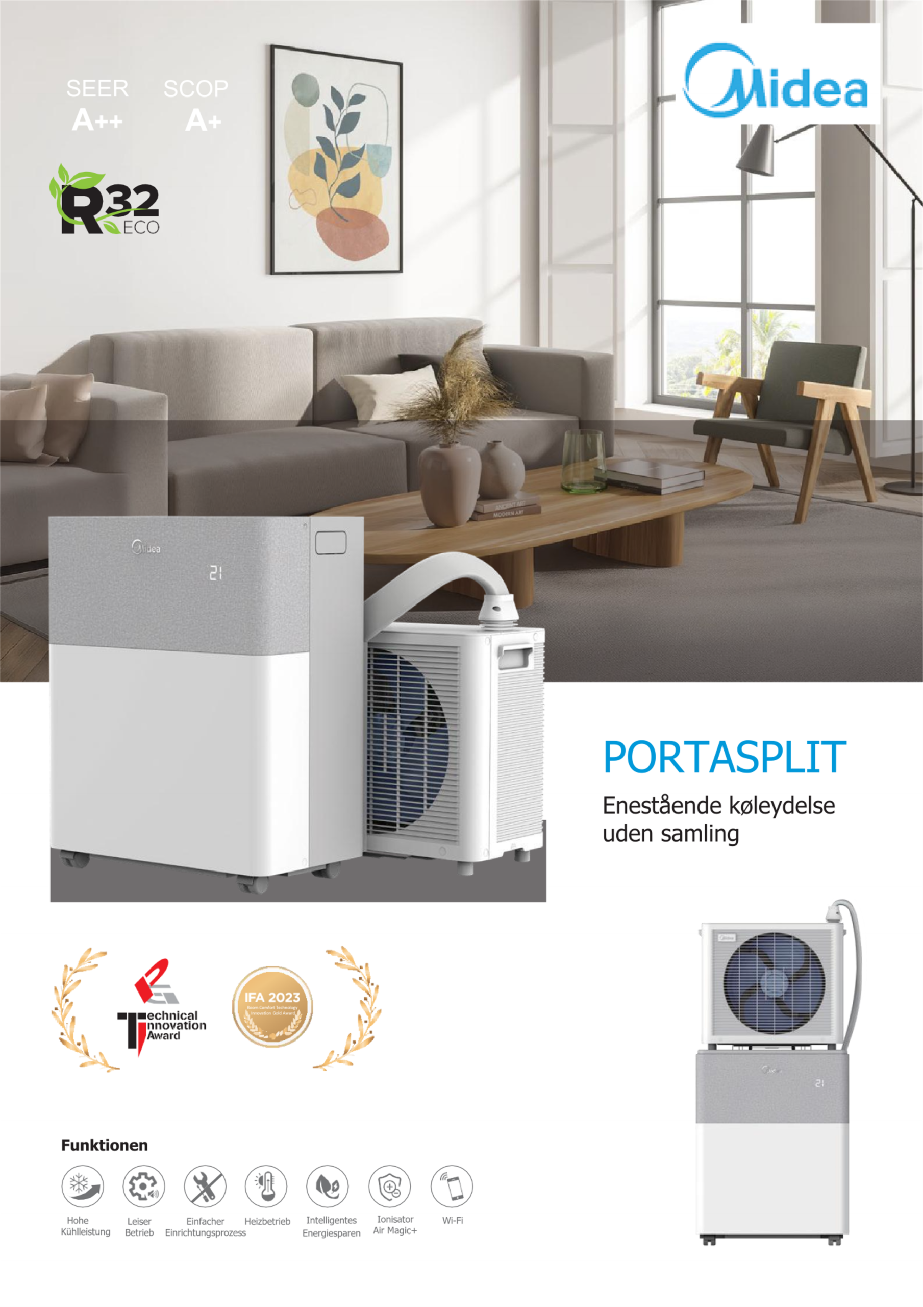 I sin funktionalitet ligner Midea PortaSplit aircondition en split aircondition. Den har en dokumenteret